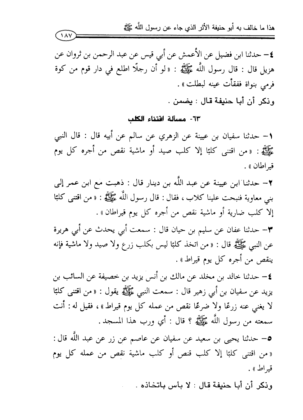 5 - حدثنا يحيى بن سعيد عن سفيان عن عاصم عن زر عن عبد الله قال: «من اقتنى كلباً إلا كلب قنص أو كلب ماشية نقص من عمله كل يوم قيراط».