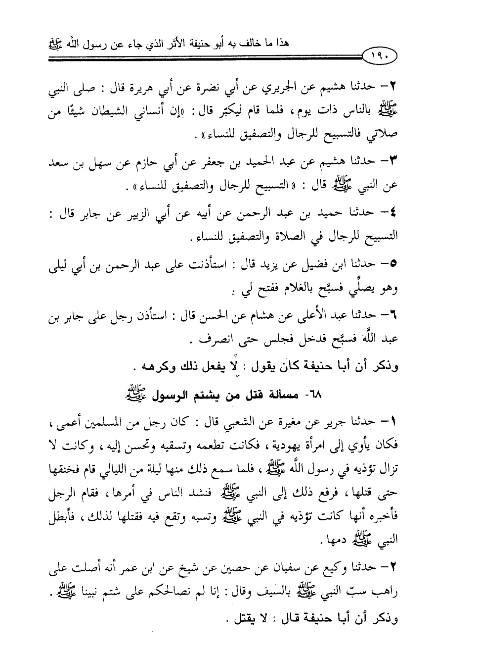 1 - حدثنا جرير عن مغيرة عن الشعبي قال: كان رجل من المسلمين أعمى فكان يأوي إلى امرأة يهودية، فكانت تطعمه وتسقيه وتحسن إليه، وكانت لا تزال تؤذيه في رسول الله صلى الله عليه وعلى آله وسلم، فلما سمع ذلك منها ليلة من الليالي قام فخنقها حتى قتلها، فرفع ذلك إلى النبي صلى الله عليه وعلى آله وسلم فنشد الناس في أمرها، فقام الرجل فأخبره أنها كانت تؤذيه في النبي صلى الله عليه وعلى آله وسلم وتسبه وتقع فيه فقتلها لذلك، فأبطل النبي صلى الله عليه وعلى آله وسلم دمها.