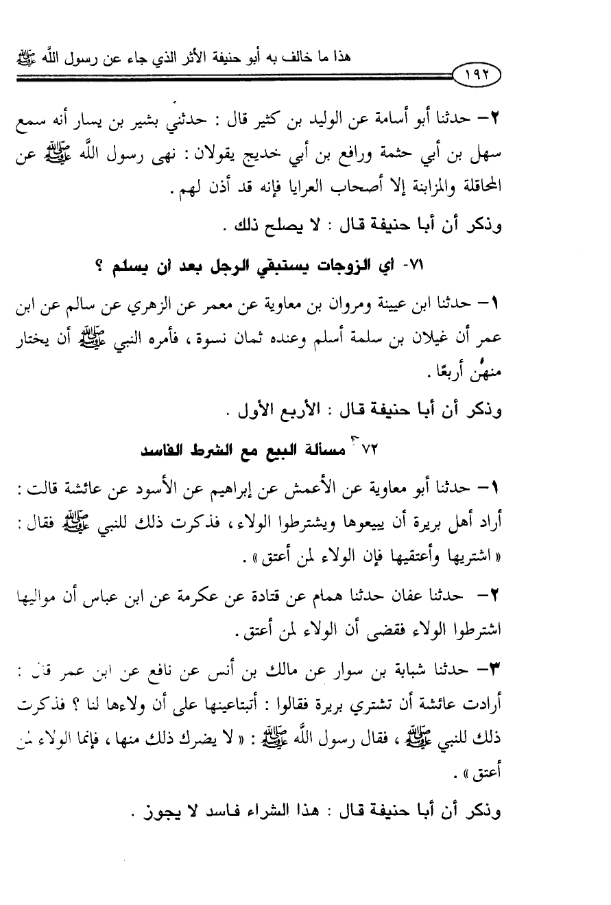 1 - حدثنا أبو معاوية عن الأعمش عن إبراهيم عن الأسود عن عائشة قالت: أراد أهل بريرة أن يبيعوها ويشترطوا الولاء، فذكرت ذلك للنبي صلى الله عليه وعلى آله وسلم فقال: «اشتريها وأعتقيها فإن الولاء لمن أعتق».
