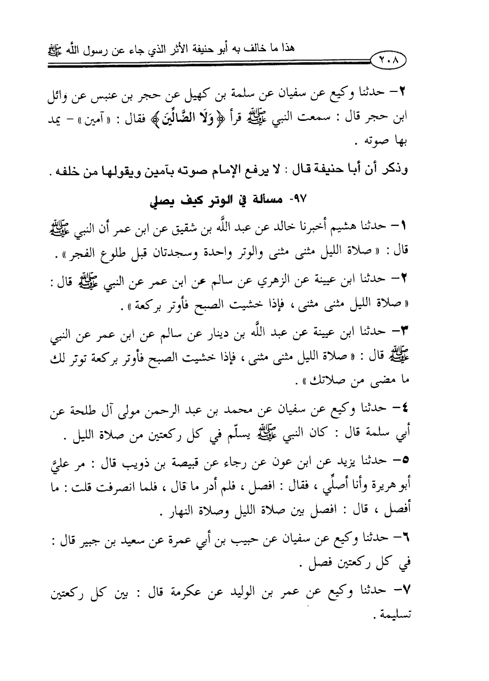 4 - حدثنا وكيع عن سفيان عن محمد بن عبد الرحمن مولى آل طلحة عن أبي سلمة قال: كان النبي صلى الله عليه وعلى آله وسلم يسلّم في كل ركعتين من صلاة الليل.