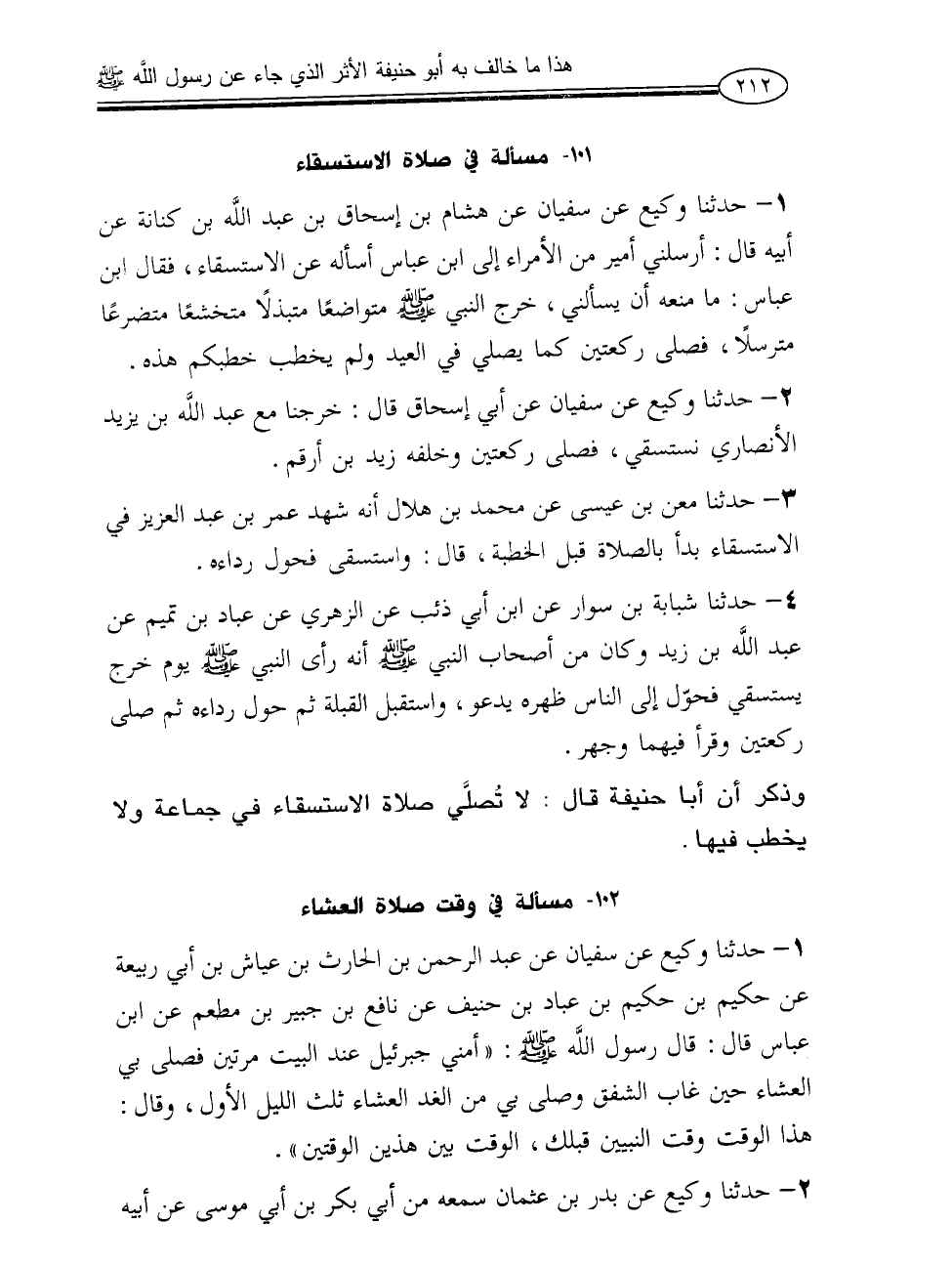 1 - حدثنا وكيع عن سفيان عن هشام بن إسحاق بن عبد الله بن كنانة عن أبيه قال: أرسلني أمير من الأمراء إلى ابن عباس أسأله عن الاستسقاء، فقال ابن عباس: ما منعه أن يسألني، خرج النبي صلى الله عليه وعلى آله وسلم متواضعاً متبذلاً متخشعاً متضرعاً مترسلاً، فصلى ركعتين ركعتين كما يصلي في العيد ولم يخطب خطبكم هذه.