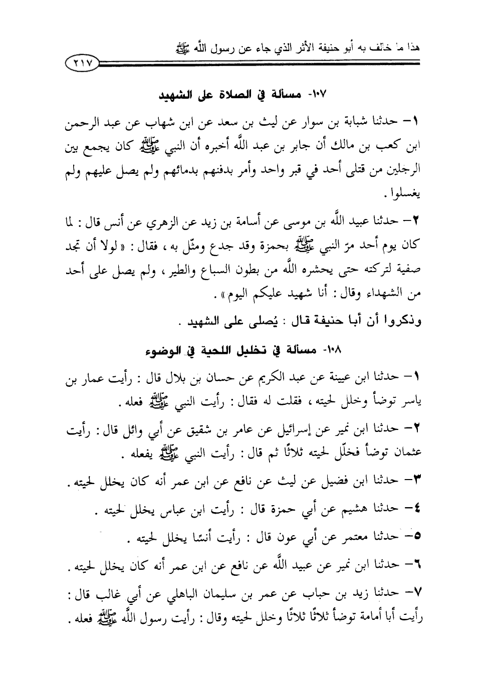 2 - حدثنا ابن نمير عن إسرائيل عن عامر بن شقيق عن أبي وائل قال: رأيت عثمان توضأ فخلّل لحيته ثلاثاً ثم قال: رأيت النبي صلى الله عليه وعلى آله وسلم يفعله.