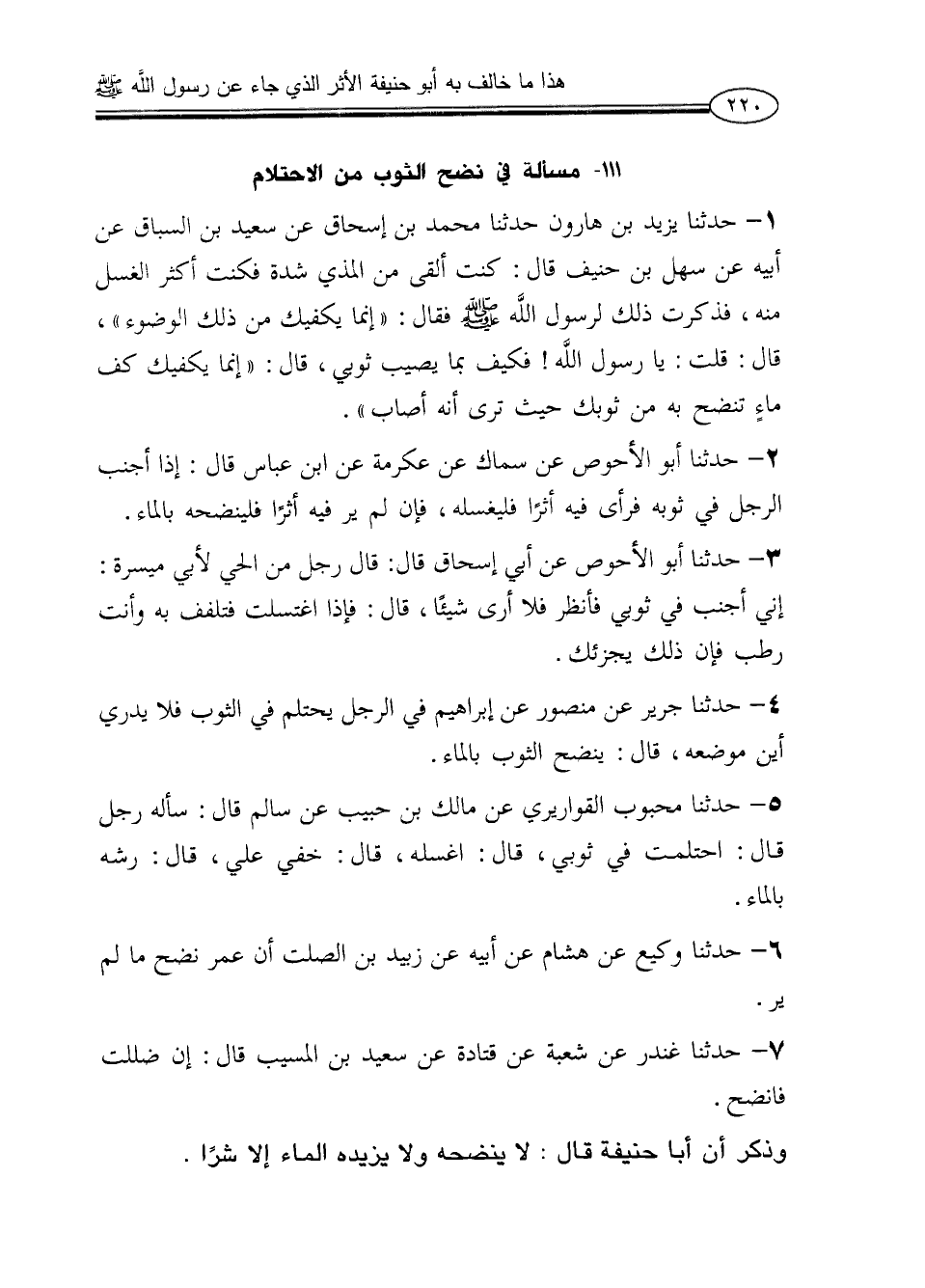 4 - حدثنا جرير عن منصور عن إبراهيم في الرجل يحتلم في الثوب فلا يدري أين موضعه، قال: ينضح الثوب بالماء.