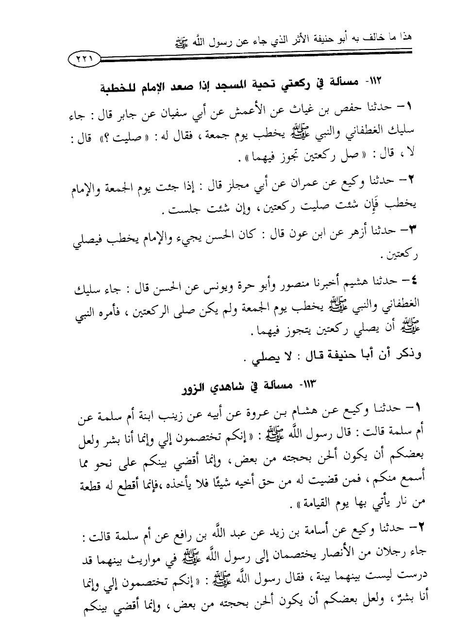 1 - حدثنا حفص بن غياث عن الأعمش عن أبي سفيان عن جابر قال: جاء سليك الغطفاني والنبي صلى الله عليه وعلى آله وسلم يخطب يوم جمعة، فقال له: «صليت؟» قال: لا، قال: «صل ركعتين تجوز فيهما».