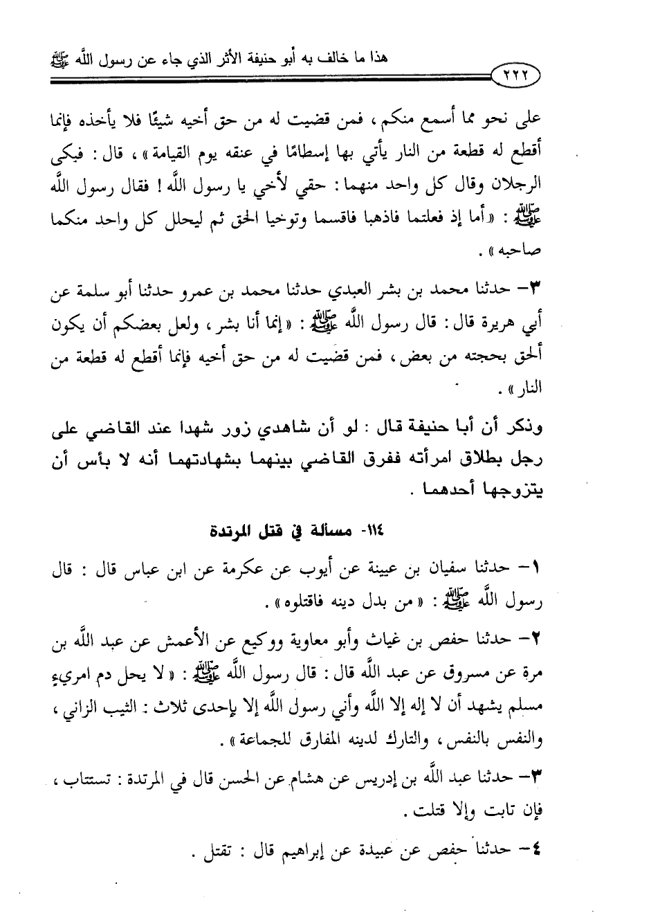 1 - حدثنا سفيان بن عيينة عن أيوب عن عكرمة عن ابن عباس قال: قال رسول الله صلى الله عليه وعلى آله وسلم: «من بدل دينه فاقتلوه».