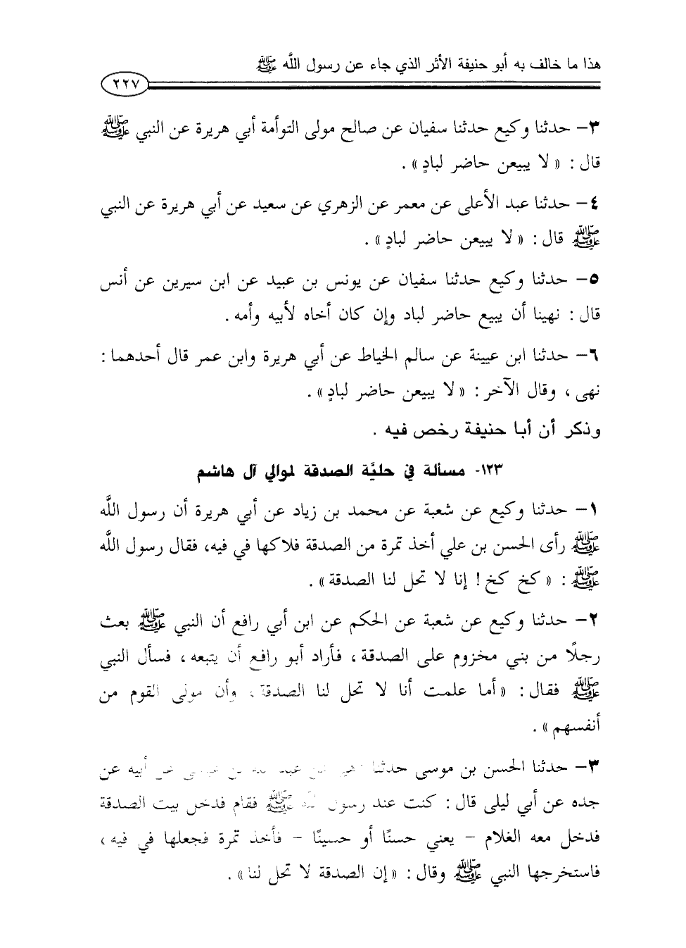 1 - حدثنا وكيع عن شعبة عن محمد بن زياد عن أبي هريرة أن رسول الله صلى الله عليه وعلى آله وسلم رأى الحسن بن علي أخذ تمرة من الصدقة فلاكها في فيه، فقال رسول الله صلى الله عليه وعلى آله وسلم: «كخ كخ! إنا لا تحل لنا الصدقة».
