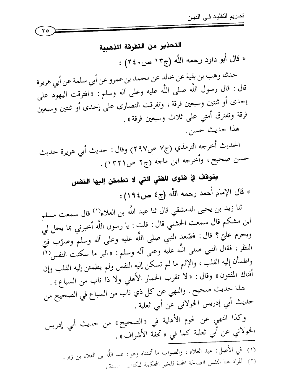 حدثنا وهب بن بقية عن خالد عن محمد بن عمرو عن أبي سلمة عن أبي هريرة قال: قال رسول الله صلى الله عليه وعلى آله وسلم: «افترقت اليهود على إحدى أو ثنتين وسبعين فرقة، وتفرقت النصارى على إحدى أو ثنتين وسبعين فرقة وتفترق أمتي على ثلاث وسبعين فرقة».