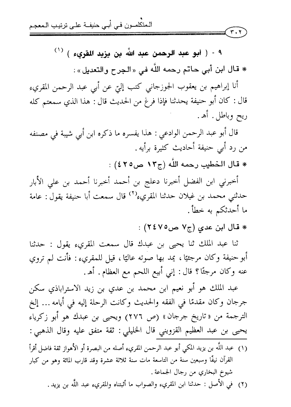 عبد الملك هو أبو نعيم ابن محمد بن عدي بن زيد الاستراباذي سكن جرجان وكان مقدماً في الفقه والحديث وكانت الرحلة إليه في أيامه ... إلخ الترجمة من «تاريخ جرجان» (ص276) ويحيى بن عبدك هو أبو زكرياء يحيى بن عبد العظيم القزويني قال الخليلي: ثقة متفق عليه وقال الذهبي: