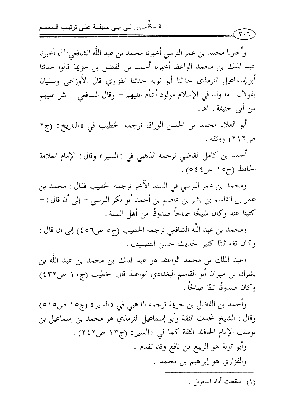 ومحمد بن عبد الله الشافعي ترجمه الخطيب (ج5ص456) إلى أن قال: وكان ثقة ثبتاً كثير الحديث حسن التصنيف.