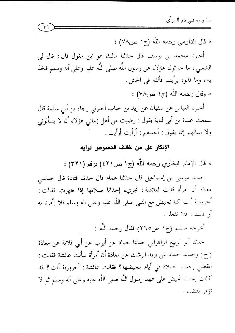 حدثنا أبو الربيع الزاهراني حدثنا حماد عن أيوب عن أبي قلابة عن معاذة (ح) وحدثنا حماد عن يزيد الرشك عن معاذة أن أمرأة سألت عائشة فقالت: أتقضي إحدانا الصلاة في أيام محيضها؟ فقالت عائشة: أحرورية أنت؟ قد كانت إحدانا تحيض على عهد رسول الله صلى الله عليه وعلى آله وسلم ثم لا تؤمر بقضاء.