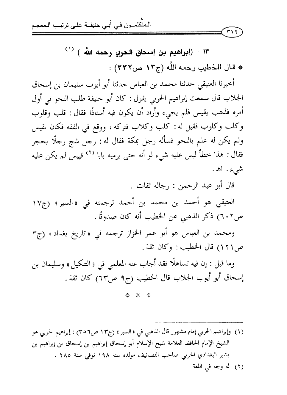 (¬1) وإبراهيم الحربي إمام مشهور قال الذهبي في «السير» (ج13ص356): إبراهيم الحربي هو الشيخ الإمام الحافظ العلامة شيخ الإسلام أبو إسحاق إبراهيم بن إسحاق بن إبراهيم بن بشير البغدادي الحربي صاحب التصانيف مولده سنة 198 توفي سنة 285.
