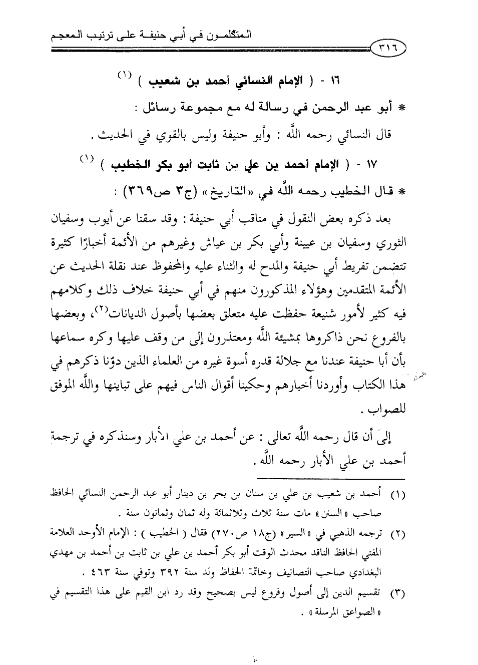 (¬2) ترجمه الذهبي في «السير» (ج18 ص270) فقال (الخطيب): الإمام الأوحد العلامة المفتي الحافظ الناقد محدث الوقت أبو بكر أحمد بن علي بن ثابت بن أحمد بن مهدي البغدادي صاحب التصانيف وخاتمة الحفاظ ولد سنة 392 وتوفي سنة 463 ,