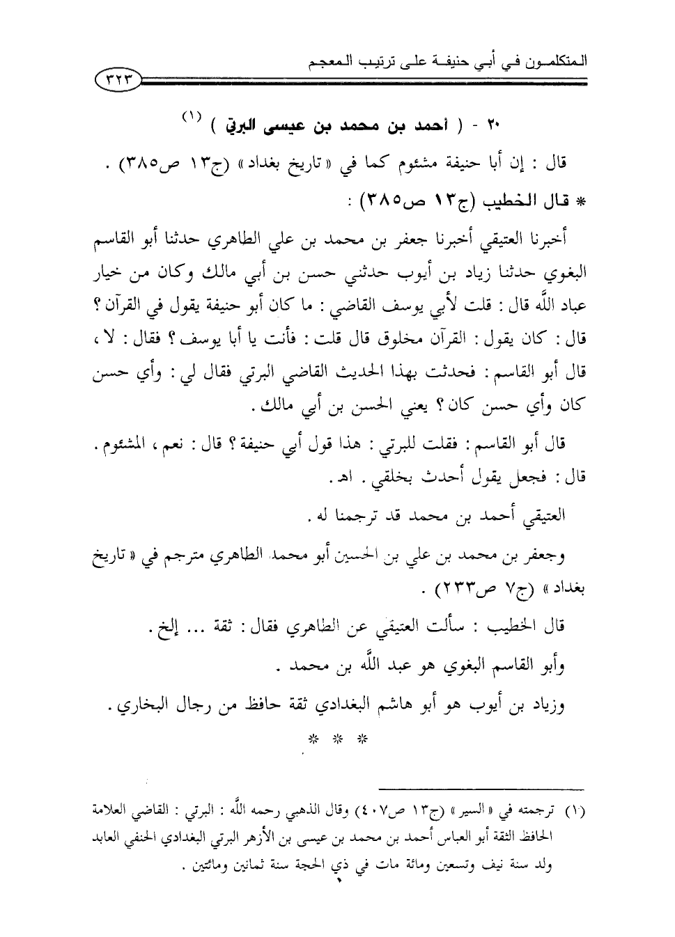 (¬1) ترجمته في «السير» (ج13ص407) وقال الذهبي رحمه الله: البرتي: القاضي العلامة الحافظ الثقة أبوالعباس أحمد بن محمد بن عيسى بن الأزهر البرتي البغدادي الحنفي العابد ولد سنة نيف وتسعين ومائة مات في ذي الحجة سنة ثمانين ومائتين.