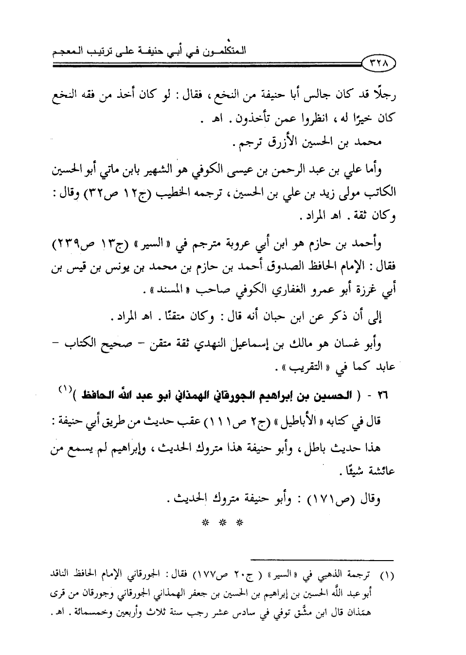 (¬1) ترجمه الذهبي في «السير» (ج20ص177) فقال: الجورقاني الإمام الحافظ الناقد أبو عبد الله الحسين بن إبراهيم بن الحسين بن جعفر الهمذاني الجورقاني وجورقان من قرى همَذان قال ابن مشَّق توفي في سادس عشر رجب سنة ثلاث وأربعين وخمسمائة. اهـ.