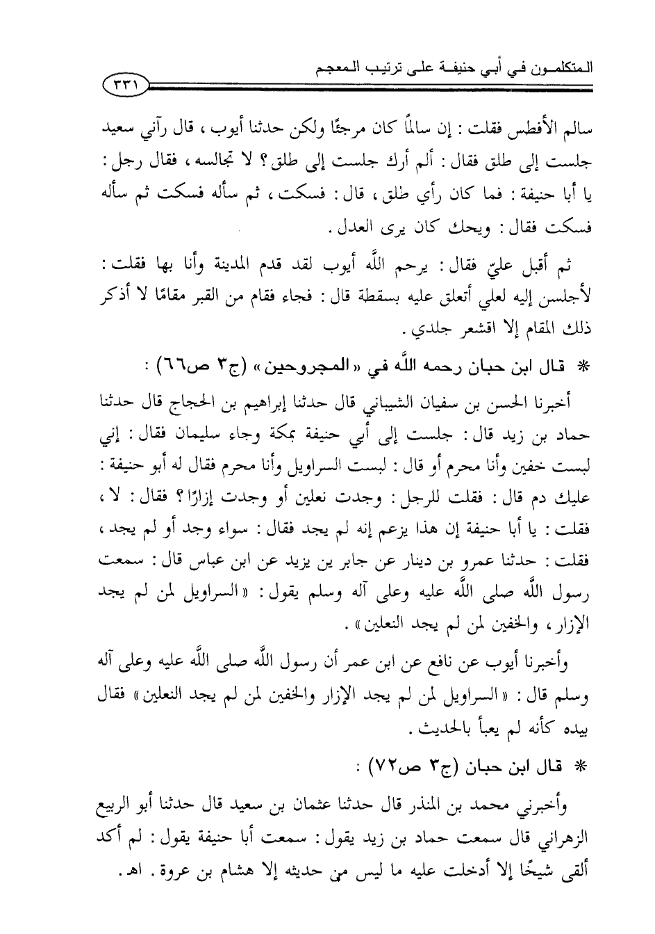 أخبرنا الحسن بن سفيان الشيباني قال حدثنا إبراهيم بن الحجاج قال حدثنا حماد بن زيد قال: جلست إلى أبي حنيفة بمكة وجاء سليمان فقال: إني لبست خفين وأنا محرم أو قال: لبست السراويل وأنا محرم فقال له أبو حنيفة: عليك دم قال: فقلت للرجل: وجدت نعلين أو وجدت إزاراً؟ فقال: لا، فقلت: يا أبا حنيفة إن هذا يزعم إنه لم يجد فقال: سواء وجد أم لم يجد، فقلت: حدثنا عمرو بن دينار عن جابر بن زيد عن ابن عباس قال: سمعت رسول الله صلى الله عليه وعلى آله وسلم يقول: «السراويل لمن لم يجد الإزار، والخفين لمن لم يجد النعلين».