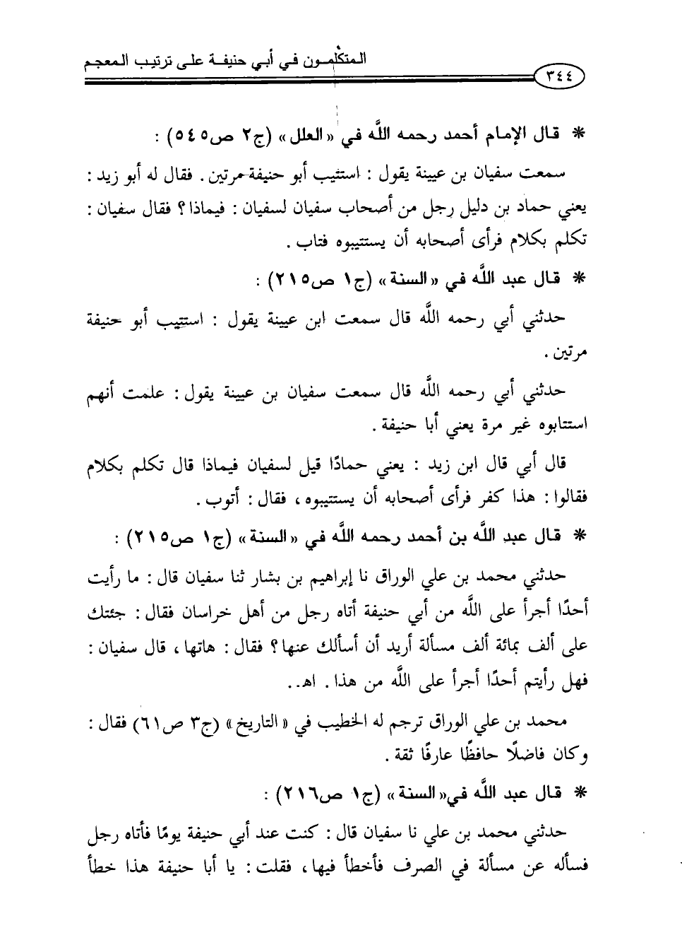 حدثني أبي رحمه الله قال سمعت سفيان بن عيينة يقول: علمت أنهم استتابوه غير مرة يعني أبا حنيفة.