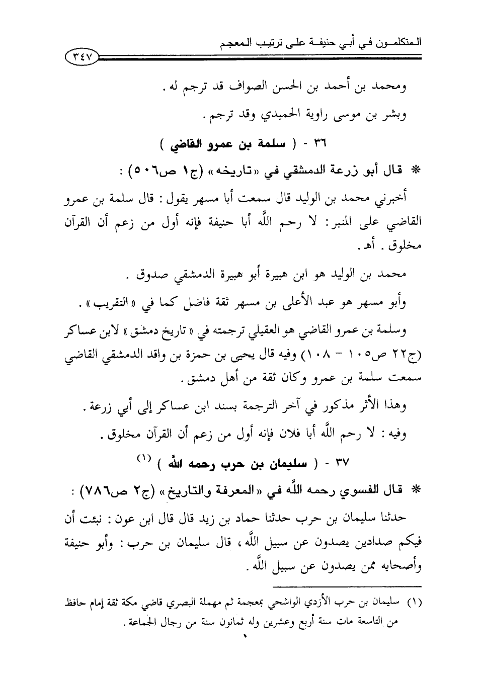 أخبرني محمد بن الوليد قال سمعت أبا مسهر يقول: قال سلمة بن عمرو القاضي على المنبر: لا رحم الله أبا حنيفة فإنه أول من زعم أن القرآن مخلوق. اهـ.