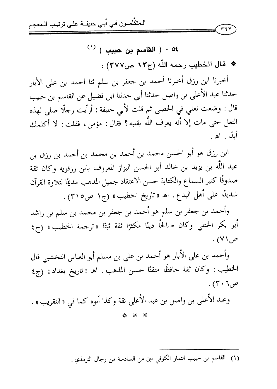 أخبرنا ابن رزق أخبرنا أحمد بن جعفر بن سلم ثنا أحمد بن علي الأبار حدثنا عبد الأعلى بن واصل حدثنا أبي حدثنا ابن فضيل عن القاسم بن حبيب قال: وضعت نعلي في الحصى ثم قلت لأبي حنيفة: أرأيت رجلاً صلى لهذه النعل حتى مات إلا أنه يعرف الله بقلبه؟ فقال: مؤمن، فقلت: لا أكلمك أبداً. اهـ.