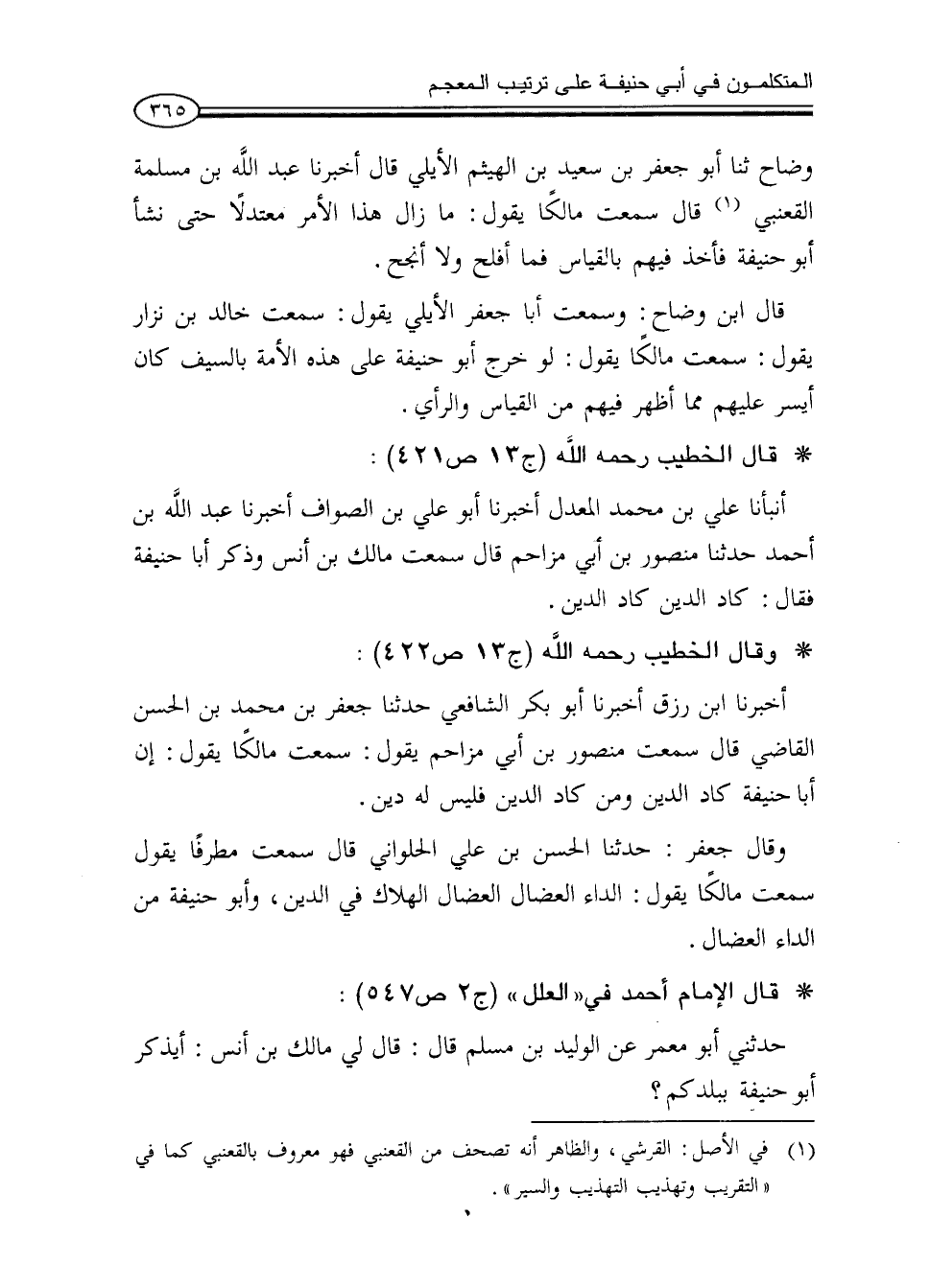 وقال جعفر: حدثنا الحسن بن علي الحلواني قال: سمعت مطرفاً يقول: سمعت مالكاً يقول: الداء العضال العضال الهلاك في الدين، وأبو حنيفة من الداء العضال.
