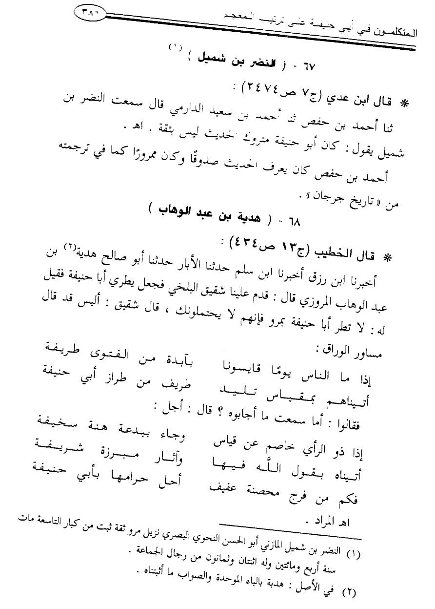 ثنا أحمد بن حفص ثنا أحمد بن سعيد الدارمي قال سمعت النضر بن شميل يقول: كان أبو حنيفة متروك الحديث ليس بثقة. اهـ.
