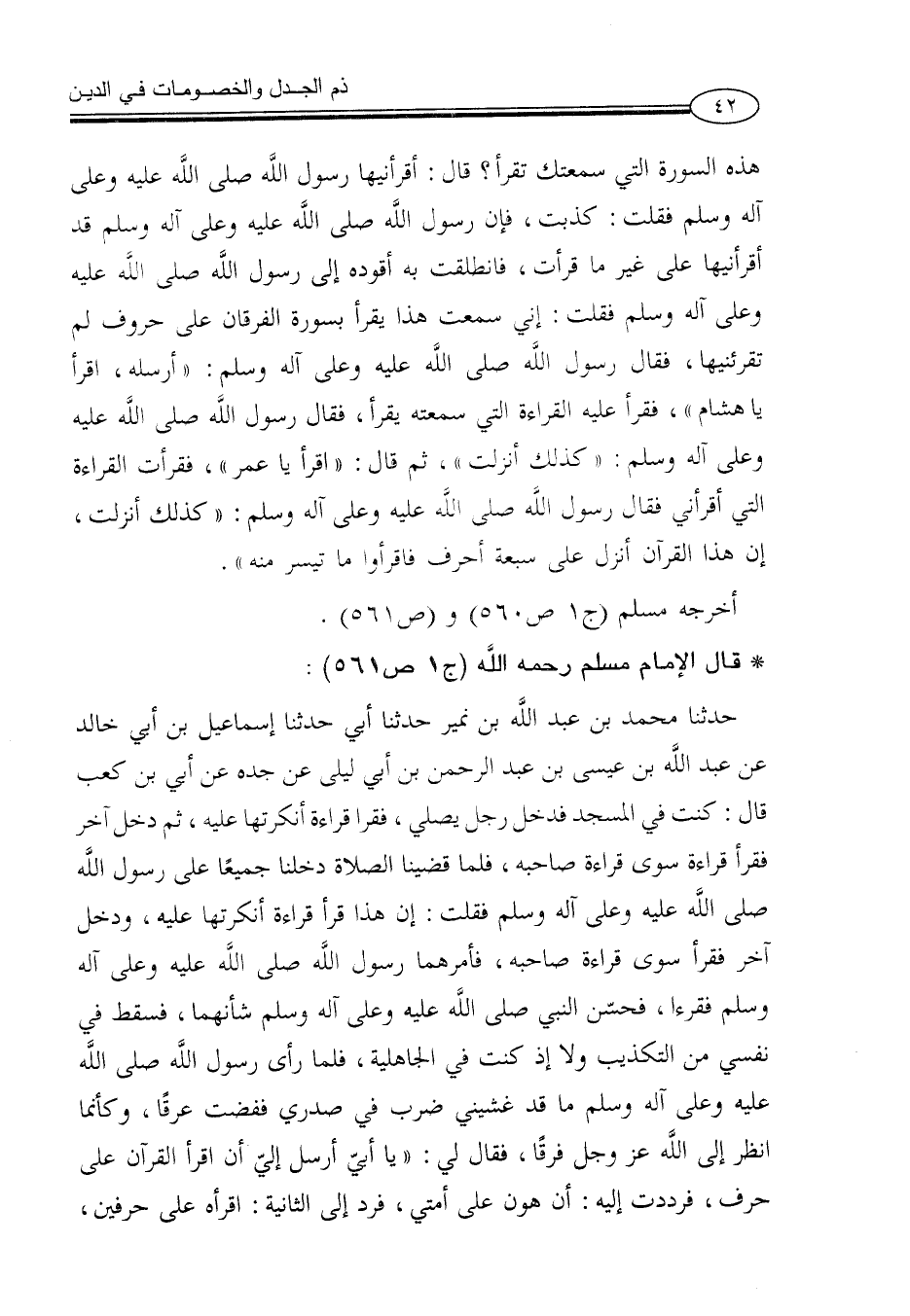 هشام»، فقرأ عليه القراءة التي سمعته يقرأ، فقال رسول الله صلى الله عليه وعلى آله وسلم: «كذلك أنزلت»، ثم قال: اقرأ يا عمر، فقرأت القراءة التي أقرأني فقال رسول الله صلى الله عليه وعلى آله وسلم: «كذلك أنزلت، إن هذا القرآن أنزل على سبعة أحرف فاقرأوا ما تيسر منه».
