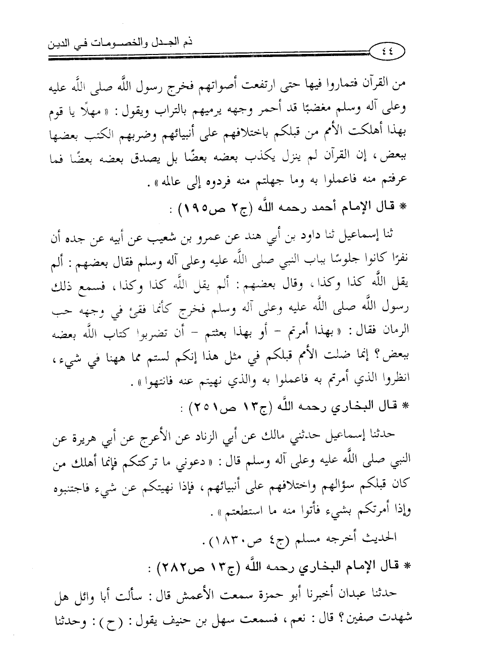 ثنا إسماعيل ثنا داود بن أبي هند عن عمرو بن شعيب عن أبه عن جده أن نفراً كانوا جلوساً بباب النبي صلى الله عليه وعلى آله وسلم فقال بعضهم: ألم يقل الله كذا وكذا، وقال بعضهم: ألم يقل الله كذا وكذا، فسمع ذلك رسول الله صلى الله عليه وعلى آله وسلم فخرج كأنما فقئ في وجهه حب الرمان فقال: «بهذا أمرتم - أو بهذا بعثتم - أن تضربوا كتاب الله بعضه ببعض؟ إنما ضلت الأمم قبلكم في مصل هذا إنكم لستم مما ههنا في شيء، انظروا الذي أمرتم به فاعملوا به والذي نهيتم عنه فانتهوا».