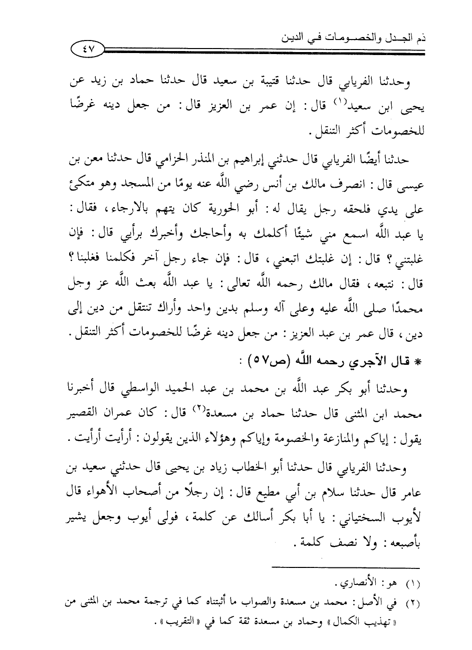 حدثنا أيضاً الفريابي قال حدثني إبراهيم بن المنذر الحزامي قال حدثنا معن بن عيسى قال: انصرف مالك بن أنس رضي الله عنه يوماً من المسجد وهو متكئ على يدي فلحقه رجل يقال له: أبو الحورية كان يتهم بالارجاء، فقال: يا عبد الله اسمع مني شيئاً أكلمك به وأحاجك وأخبرك برأيي، قال: فإن غلبتني؟ قال: إن غلبتك اتبعني، قال: فإن جاء رجل آخر فكلمنا فغلبنا؟، قال: نتبعه، فقال مالك رحمه الله تعالى: يا عبد الله بعث الله عز وجل محمداً صلى الله عليه وعلى آله وسلم بدين واحد وأراك تنتقل من دين إلى دين، قال عمر بن عبد العزيز: من جعل دينه غرضاً للخصومات أكثر التنقل.
