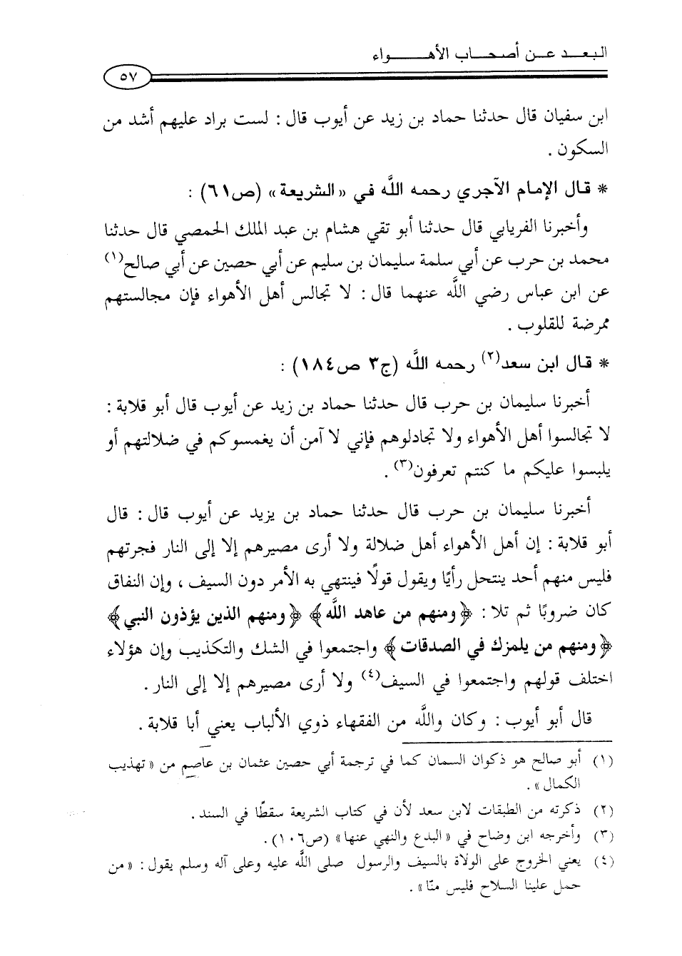 أخبرنا سليمان بن حرب قال حدثنا حماد بن يزيد عن أيوب قال: قال أبو قلابة: إن أهل الأهواء أهل ضلالة ولا أرى مصيرهم إلا إلى النار فجرتهم فليس منهم أحد ينتحل رأياً ويقول قولاً فينتهي به الأمر دون السيف، وإن النفاق كان ضروباً ثم تلا: {وَمِنْهُم مَّنْ عَاهَدَ اللهَ} {وَمِنْهُمُ الَّذِينَ يُؤْذُونَ النَّبِيَّ} {وَمِنْهُم مَّن يَلْمِزُكَ فِي الصَّدَقَاتِ} واجتمعوا في الشك والتكذيب وإن هؤلاء اختلف قولهم واجتمعوا في السيف (¬4) ولا أرى مصيرهم إلا إلى النار.