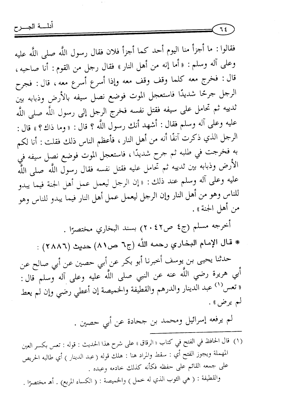 فقالوا: ما أجزأ منا اليوم أحد كما أجزأ فلان فقال رسول الله صلى الله عليه وعلى آله وسلم: «أما إنه من أهل النار» فقال رجل من القوم: أنا صاحبه، قال: فخرج معه كلما وقف وقف معه وإذا أسرع أسرع معه، قال: فجرح الرجل جرحاً شديداً فاستعجل الموت فوضع نصل سيفه بالأرض وذبابه بين ثدييه ثم تحامل على سيفه فقتل نفسه فخرج الرجل إلى رسول الله صلى الله عليه على آله وسلم فقال: أشهد أنك رسول الله؟ قال: «وما ذاك؟» قال: الرجل الذي ذكرت آنفاً أنه من أهل النار، فأعظم الناس ذلك فقلت: أنا لكم به فخرجت في طلبه ثم جرح شديداً، فاستعجل الموت فوضع نصل سيفه في الأرض وذبابه بين ثدييه ثم تحامل عليه فقتل نفسه فقال رسول الله صلى لله علي وعلى آله وسلم عند ذلك: «إن الرجل ليعمل عمل أهل الجنة فيما يبدو للناس وهو من أهل النار وإن الرجل ليعمل بعمل أهل النار فيما يبدو للناس وهو من أهل الجنة».