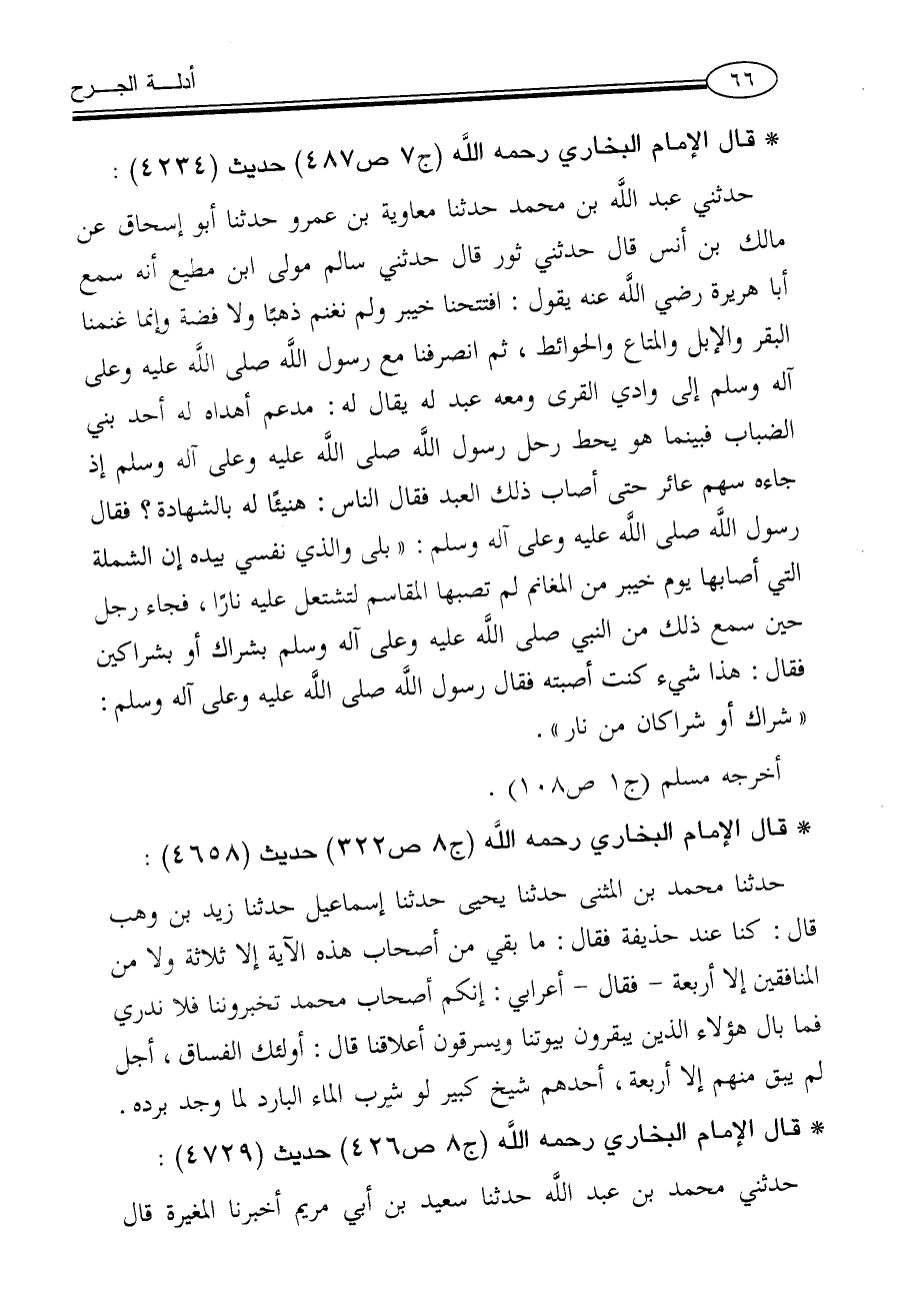 حدثني عبد الله بن محمد حدثنا معاوية بن عمرو حدثنا أبو إسحاق عن مالك بن أنس قال حدثني ثور قال حدثني سالم مولى ابن مطيع أنه سمع أبا هريرة رضي الله عنه يقول: افتتحنا خيبر ولم نغنم ذهباً ولا فضة وإنما غنمنا البقر والإبل والمتاع والحوائط، ثم انصرفنا مع رسول الله صلى الله عليه وعلى آله وسلم إلى وادي القرى ومعه عبد له يقال له: مدعم أهداه له أحد بني الضباب فبينما هو يحط رحل رسول الله صلى الله عليه وعلى آله وسلم إذ جاءه سهم عائر حتى أصاب ذلك العبد فقال الناس: هنيئاً له الشهادة؟ فقال رسول الله صلى الله عليه وعلى آله وسلم: «بلى والذي نفسي بيده إن الشملة التي أصابها يوم خيبر من المغانم لم تصبها المقاسم لتشتعل عليه ناراً»، فجاء رجل حين سمع ذلك من النبي صلى الله عليه وعلى آله وسلم بشراك أو بشراكين فقال: هذا شيء كنت أصبته فقال رسول الله صلى الله عليه وعلى آله وسلم: «شراك أو شراكان من نار».