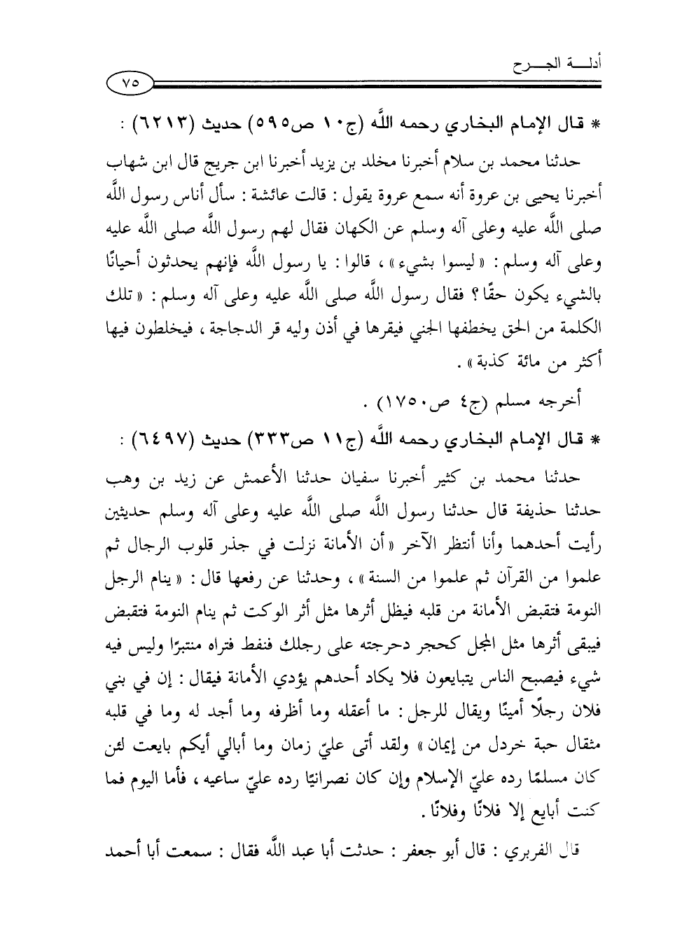 حدثنا محمد بن سلام أخبرنا مخلد بن يزيد أخبرنا ابن جريج قال ابن شهاب أخبرني يحيى بن عروة أنه سمع عروة يقول: قالت عائشة: سأل أناس رسول الله صلى الله عليه وعلى آله وسلم عن الكهان فقال لهم رسول الله صلى الله عليه وعلى آله وسلم: «ليسوا بشيء»، قالوا: يا رسول الله فإنهم يحدثون أحياناً بالشيء يكون حقاً؟ فقال رسول الله صلى الله عليه وعلى آله وسلم: «تلك الكلمة من الحق يخطفها الجني فيقرها في أذن وليه قر الدجاجة، فيخلطون فيها أكثر من مائة كذبة».