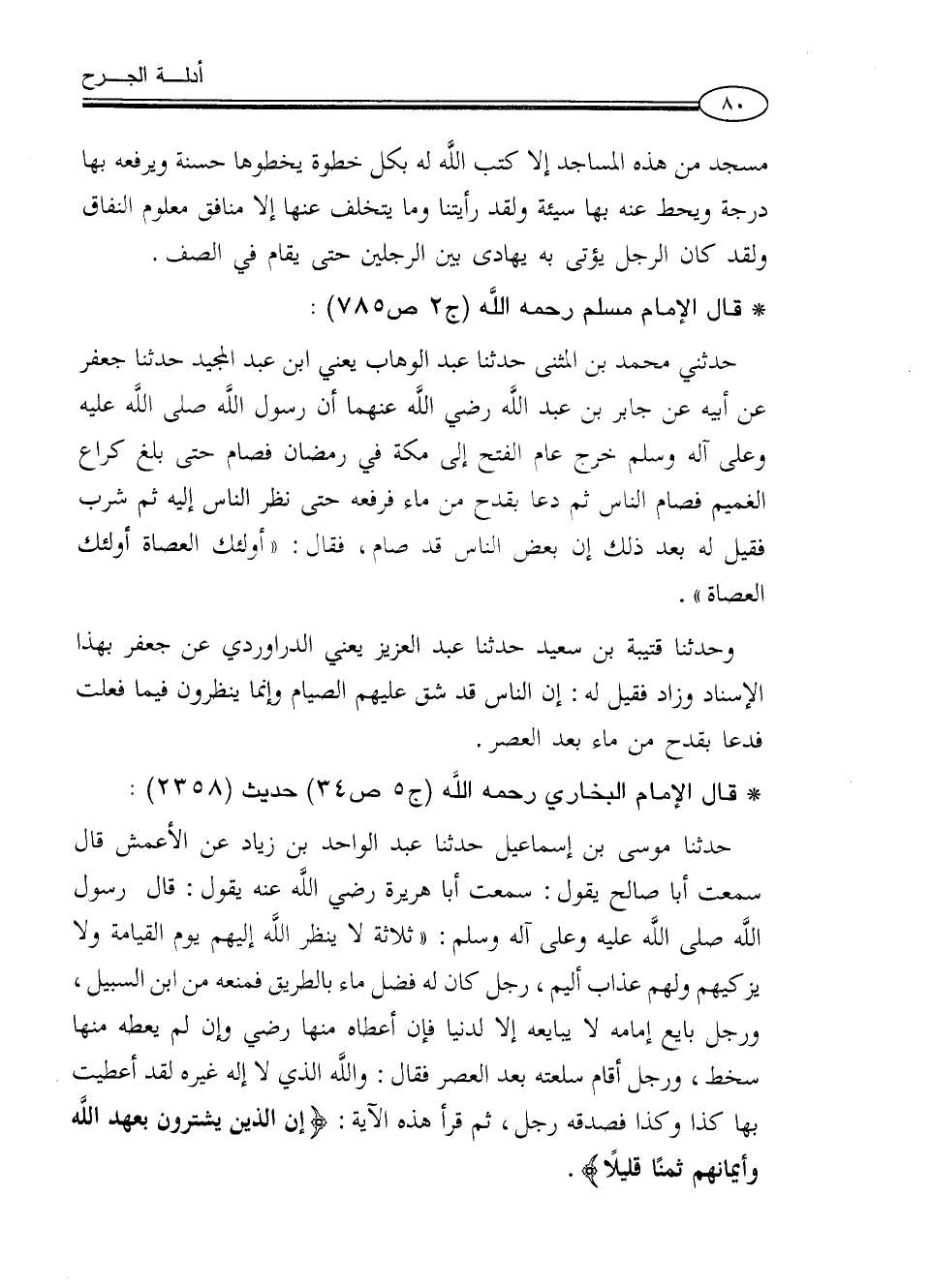 حدثنا موسى بن إسماعيل حدثنا عبد الواحد بن زياد عن الأعمش قال سمعت أبا صالح يقول: سمعت أبا هريرة رضي الله عنه يقول: قال رسول الله صلى الله عليه وعلى آله وسلم: «ثلاثة لا ينظر الله إليهم يوم القيامة ولا يزكيهم ولهم عذاب أليم، رجل كان له فضل ماء بالطريق فمنعه من ابن السبيل، ورجل بايع إمامه لا يبايعه إلا لدنيا فإن أعطاه منها رضي وإن لم يعطه منها سخط، ورجل أقام سلعته بعد العصر فقال: والله الذي لا إله غيره لقد أعطيت بها كذا وكذا فصدقه رجل» ثم قرأ هذه الآية {إِنَّ الَّذِينَ يَشْتَرُونَ بِعَهْدِ اللهِ وَأَيْمَانِهِمْ ثَمَنًا قَلِيلاً}.