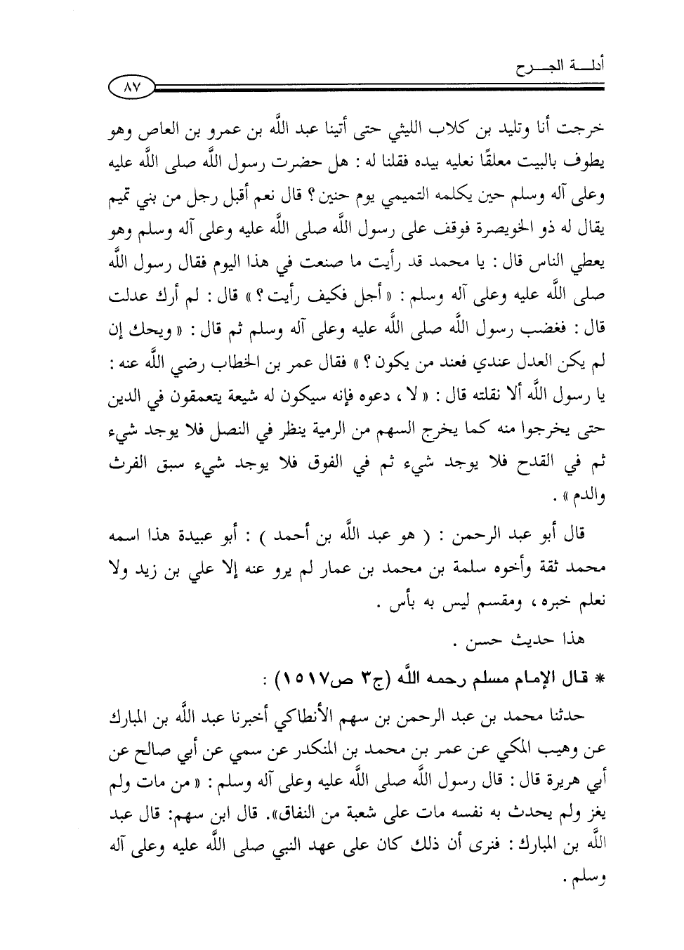 خرجت أنا وتليد بن كلاب الليثي حتى أتينا عبد الله بن عمرو بن العاص وهو يطوف بالبيت معلقاً نعليه بيده فقلنا له: هل حضرت رسول الله صلى الله عليه وعلى آله وسلم حين يكلمه التميمي يوم حنين؟ قال نعم أقبل رجل من بني تميم يقال له ذو الخويصرة فوقف على رسول الله صلى الله عليه وعلى آله وسلم وهو يعطي الناس قال: يا محمد قد رأيت ما صنعت في هذا اليوم فقال رسول الله صلى الله عليه وعلى آله وسلم: «أجل فكيف رأيت؟»، قال: لم أرك عدلت، قال: فغضب رسول الله صلى الله عليه وعلى آله وسلم ثم قال: «ويحك إن لم يكن العدل عندي فعند من يكون؟»، فقال عمر بن الخطاب رضي الله عنه: يا رسول الله ألا نقتله، قال: «لا»، دعوه فإنه سيكون له شيعة يتعمقون في الدين حتى يخرجوا منه كما يخرج السهم من الرمية ينظر في النصل فلا يوجد شيء ثم في القدح فلا يوجد شيء ثم في الفوق فلا يوجد شيء سبق الفرث والدم».