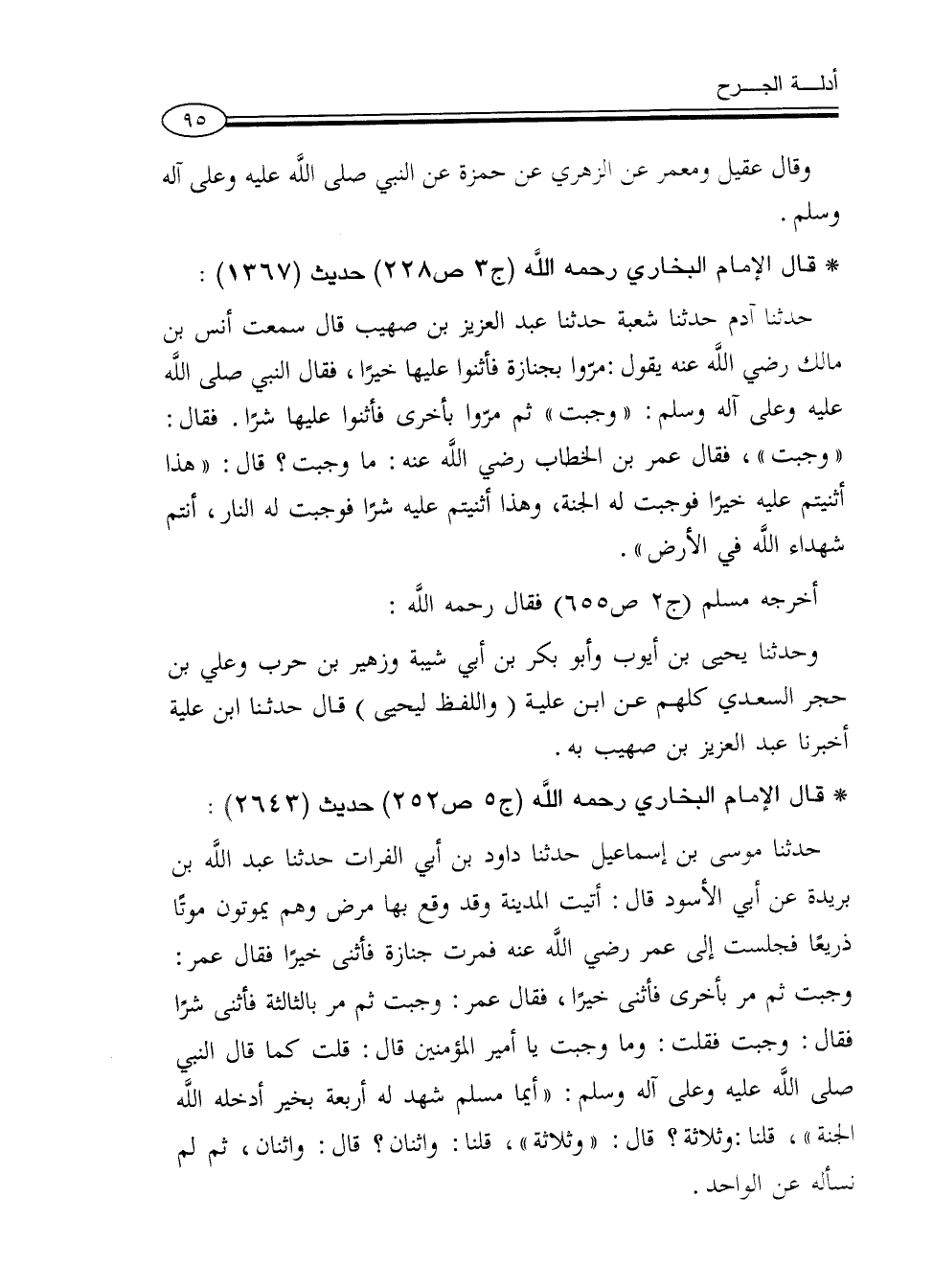 حدثنا موسى بن إسماعيل حدثنا داود بن أبي الفرات حدثنا عبد الله بن بريدة عن أبي الأسود قال أتيت المدينة وقد وقع بها مرض وهم يموتون موتا ذريعا فجلست إلى عمر رضي الله عنه فمرت جنازة فأثني خيرا فقال عمر وجبت ثم مر بأخرى فأثني خيرا فقال وجبت ثم مر بالثالثة فأثني شرا فقال وجبت فقلت وما وجبت يا أمير المؤمنين قال قلت كما قال النبي صلى الله عليه وعلى آله وسلم: «أيما مسلم شهد له أربعة بخير أدخله الله الجنة»، قلنا وثلاثة؟ قال: «وثلاثة»، قلنا: واثنان؟ قال: «واثنان»، ثم لم نسأله عن الواحد.