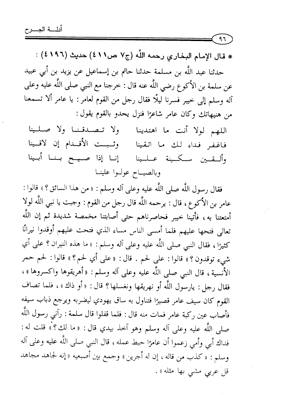 فقال رسول الله صلى الله عليه وعلى آله وسلم: «من هذا السائق؟» قالوا: عامر بن الأكوع، قال: يرحمه الله، قال رجل من القوم: وجبت يا نبي الله لولا أمتعتنا به، فأتينا خيبر فحاصرناهم حتى أصابتنا مخمصة شديدة ثم إن الله تعالى فتحها عليهم فلما أمسى الناس مساء اليوم الذي فتحت عليهم أوقدوا نيرانا كثيرة فقال النبي صلى الله عليه وعلى آله وسلم: «ما هذه النيران؟ على أي شيء توقدون؟» قالوا: على لحم، قال: «على أي لحم؟» قالوا: لحم حمر الإنسية، قال النبي صلى الله عليه وعلى آله وسلم: «أهريقوها واكسروها»، فقال رجل: يا رسول الله أو نهريقها ونغسلها؟ قال: «أو ذاك»، فلما تصاف القوم كان سيف عامر قصيراً فتناول به ساق يهودي ليضربه ويرجع ذباب سيفه فأصاب عين ركبة عامر فمات منه قال: فلما قفلوا قال سلمة: رآني رسول الله صلى الله عليه وسلم وهو آخذ بيدي قال: «ما لك؟» قلت له: فداك أبي وأمي زعموا أن عامراً حبط عمله، قال النبي صلى الله عليه وعلى آله وسلم: «كذب من قاله، إن له لأجرين» وجمع بين إصبعيه «إنه لجاهد مجاهد قل عربي مشى بها مثله».