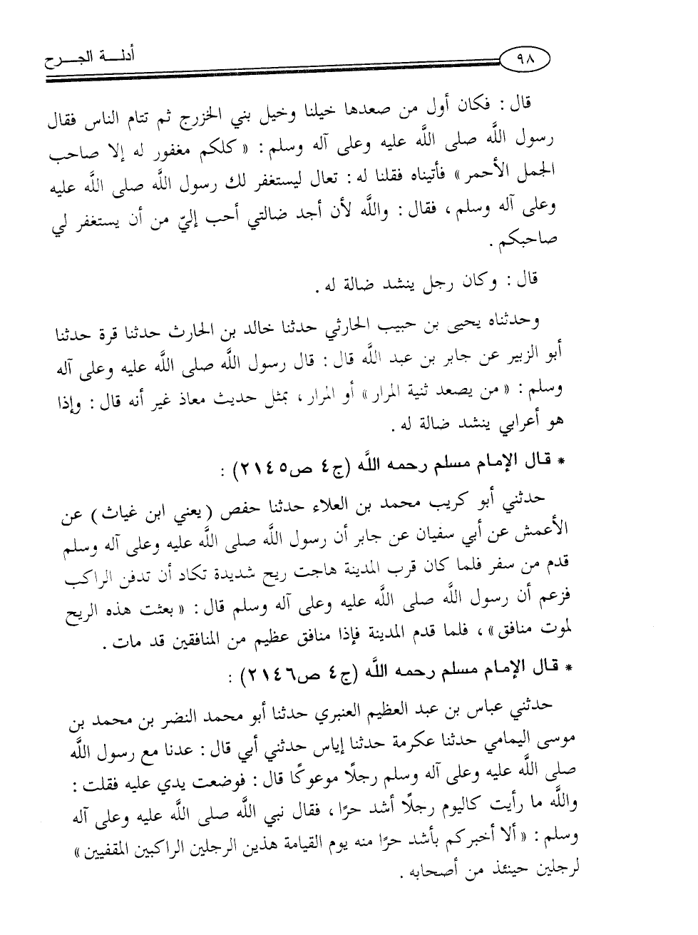 قال: فكان أول من صعدها خيلنا خيل بني الخزرج ثم تنام الناس فقال رسول الله صلى الله عليه وعلى آله وسلم: «وكلكم مغفور له إلا صاحب الجمل الأحمر» فأتيناه فقلنا له: تعال ليستغفر لك رسول الله صلى الله عليه وعلى آله وسلم، فقال: والله لأن أجد ضالتي أحب إليّ من أن يستغفر لي صاحبكم.