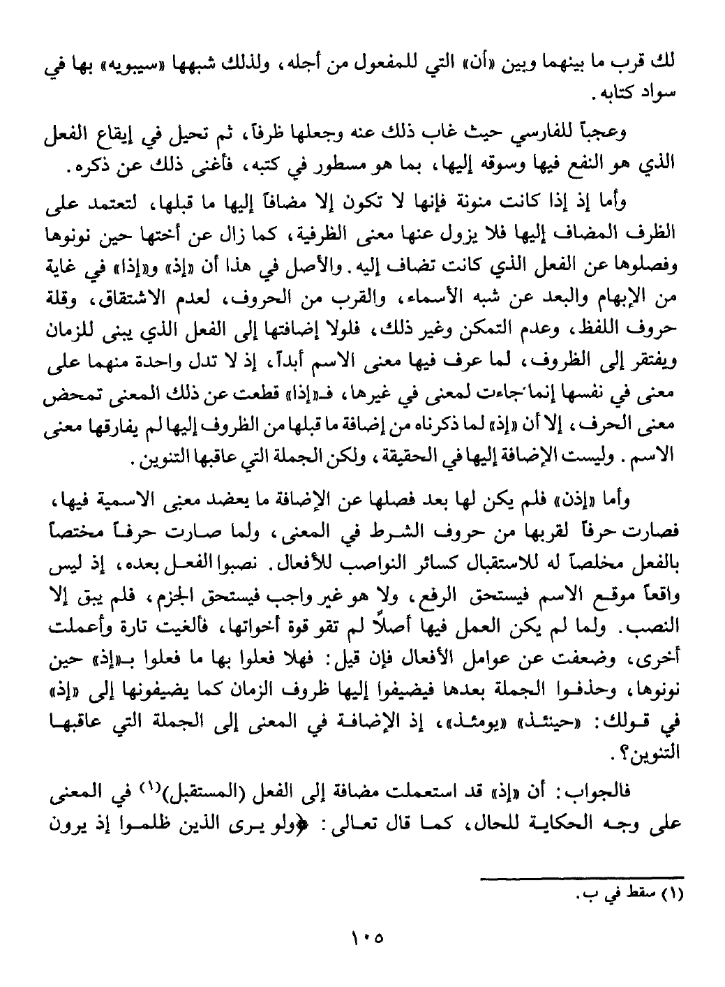 والأصل في هذا أن " إذا و " إذا " في غاية من الإبهام والبعد عن شبه الأسماء، والقرب من الحروف، لعدم الاشتقاق، وقلة حروف اللفظ، وعدم التمكن وغير ذلك، فلولا إضافتها إلى الفعل الذي يبنى للزمان