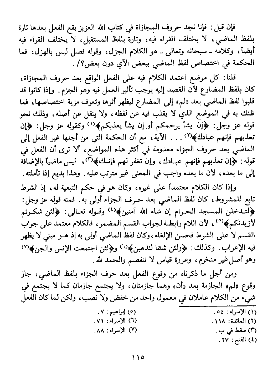 وإذا كانوا قد قلبوا لفظ الماضي بعد " لم " إلى المضارع ليظهر أثرها وتعرف مزية اختصاصها، فما ظنك به في الموضع الذي لا يقلب فيه عن لفظه، ولا ينقل عن أصله، وذلك نحو قوله عز وجل: (إِنْ يَشَأْ يَرْحَمْكُمْ أَوْ إِنْ يَشَأْ يُعَذِّبْكُمْ) وكقوله عز وجل: (إِنْ تُعَذِّبْهُمْ فَإِنَّهُمْ عِبَادُكَ) الآية.