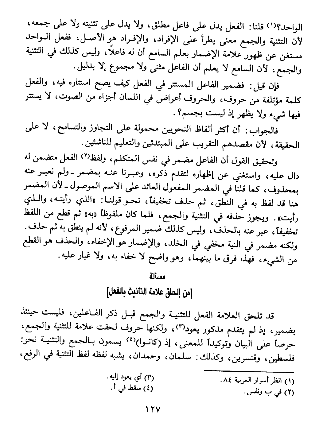 قد تلحق العلامة الفعل للتثنية والجمع قبل ذكر الفاعلين، فليست حينئذ