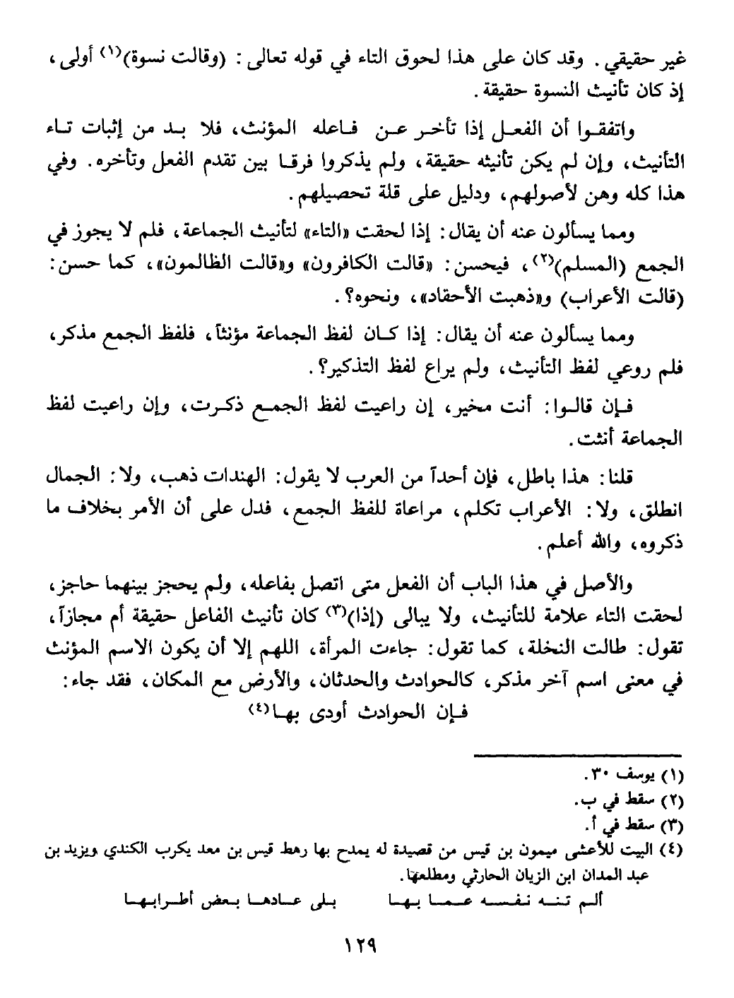 ومما يسألون عنه أن يقال: إِذا لحقت " التاء " لتأنيث الجماعة، فلم لا يجوز في الجمع (المسلم) ، فيحسن: " قالت الكافرون " و " قالت الظالمون "، كما حسن: (قالت الأعراب) و " ذهبت الأحقاد "، ونحوه؟.