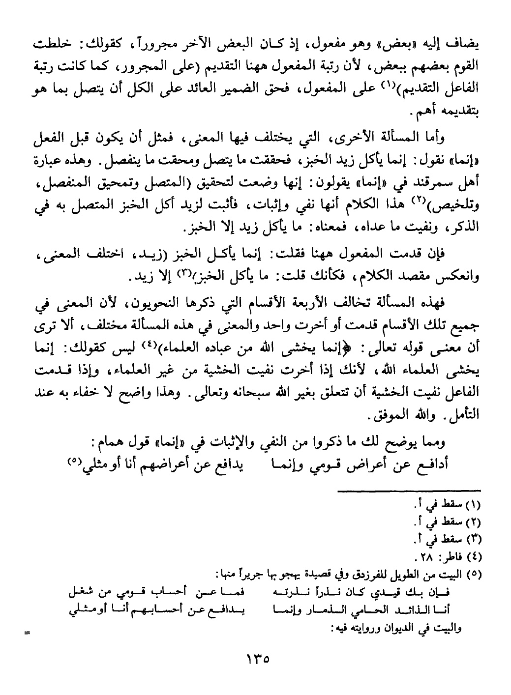 جميع تلك الأقسام قدمت أو أخرت واحد والمعنى في هذه المسألة مختلف، ألا ترى أن معنى قوله تعالى: (إنما يخشى الله من عباده العلماء) ليس كقولك: إنما يخشى العلماء الله، لأنك إذا أخرت نفيت الخشية من غير العلماء، وإذا قدمت الفاعل نفيت الخشية أن تتعلق بغير الله سبحانه وتعالى.
