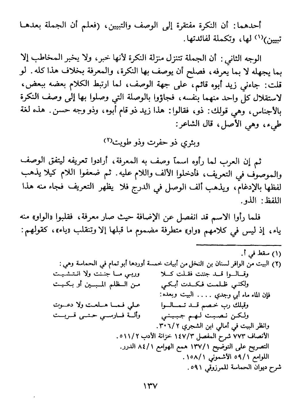 بما يجهله لا بما يعرفه، فصلح أن يوصف بها النكرة، والمعرفة بخلاف هذا كله. لو قلت: جاءني زيد أبوه قائم، على جهة الوصف، لما ارتبط الكلام بعضه ببعض، لاستقلال كل واحد منهما بنفسه، فجاؤوا بالوصلة التي وصلوا بها إلى وصف النكرة بالأجناس، وهي قولك: ذو، فقالوا: هذا زيد ذو قام أبوه، وذو وجه حسن.