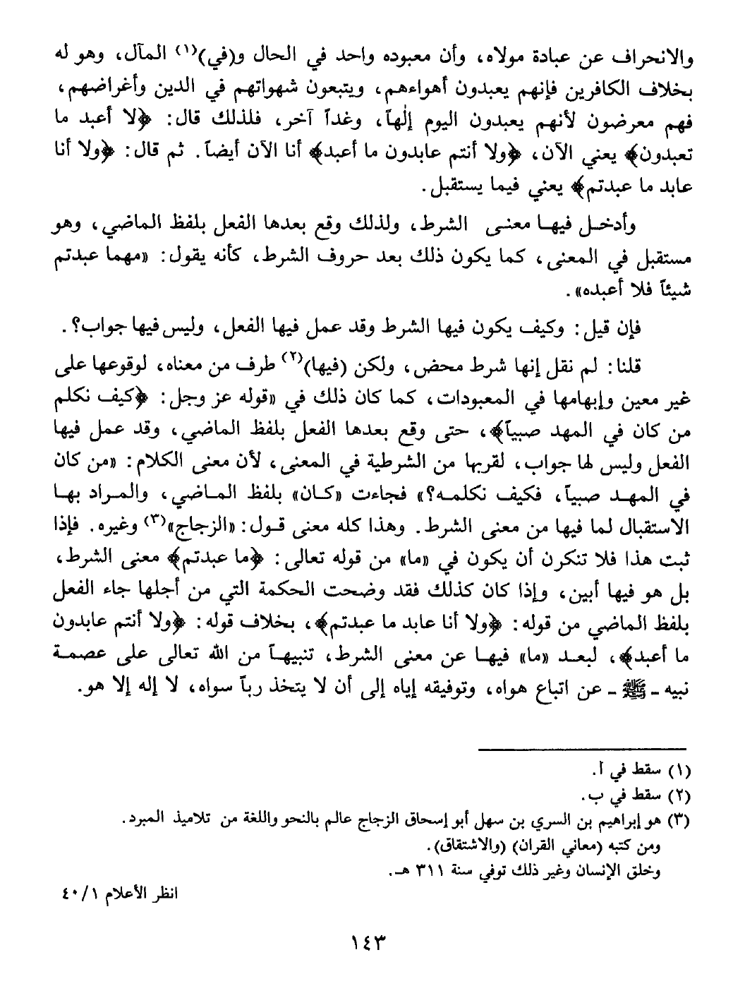فإذا ثبت هذا فلا تنكرن أن يكون في " ما " من قوله تعالى: (ما عبدتم) معنى الشرط، بل هو فيها أبين، وإذا كان كذلك فقد وضحت الحكمة التي من أجلها جاء الفعل بلفظ الماضي من قوله: (وَلَا أَنَا عَابِدٌ مَا عَبَدْتُمْ) .