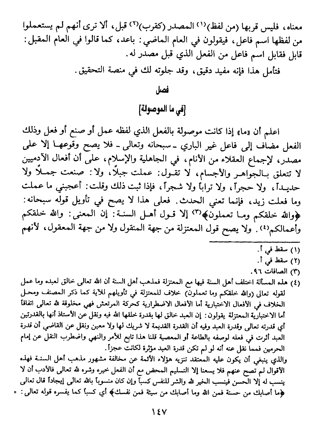 اعلم أن " ما " إذا كانت موصولة بالفعل الذي لفظه عمل أو صنع أو فعل وذلك الفعل مضاف إلى فاعل غير الباري - سبحانه وتعالى - فلا يصح وقوعها إلا على مصدر، لإجماع العقلاء من الأنام، في الجاهلية والإسلام، على أن أفعال الآدميين لا تتعلق بالجواهر والأجسام، لا تقول: عملت جبلاً، ولا: صنعت جملًا ولا حديداً، ولا حجراً، ولا ترابا ولا شجراً.