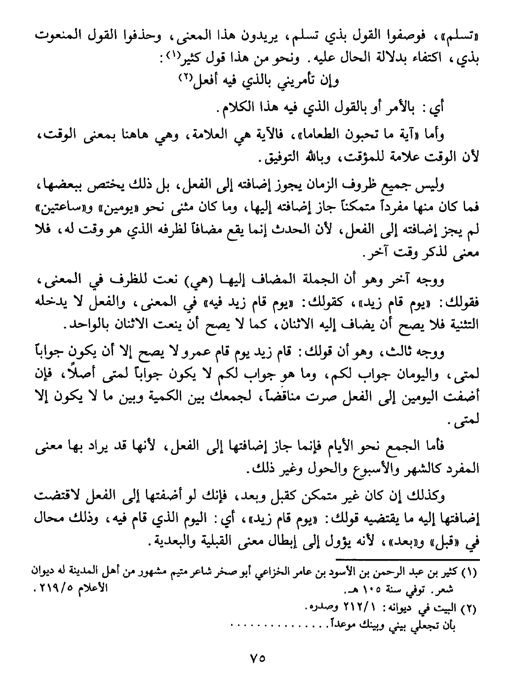 ووجه ثالث، وهو أن قولك: قام زيد يوم قام عمرو لا يصح إلا أن يكون جواباً لمتى، واليومان جواب لكم، وما هو جواب لكم لا يكون جواباً لمتى أصلاً، فإن أضفت اليومين إلى الفعل صرت مناقضا، لجمعك بين الكمية وبين ما لا يكون إلا لمتى.