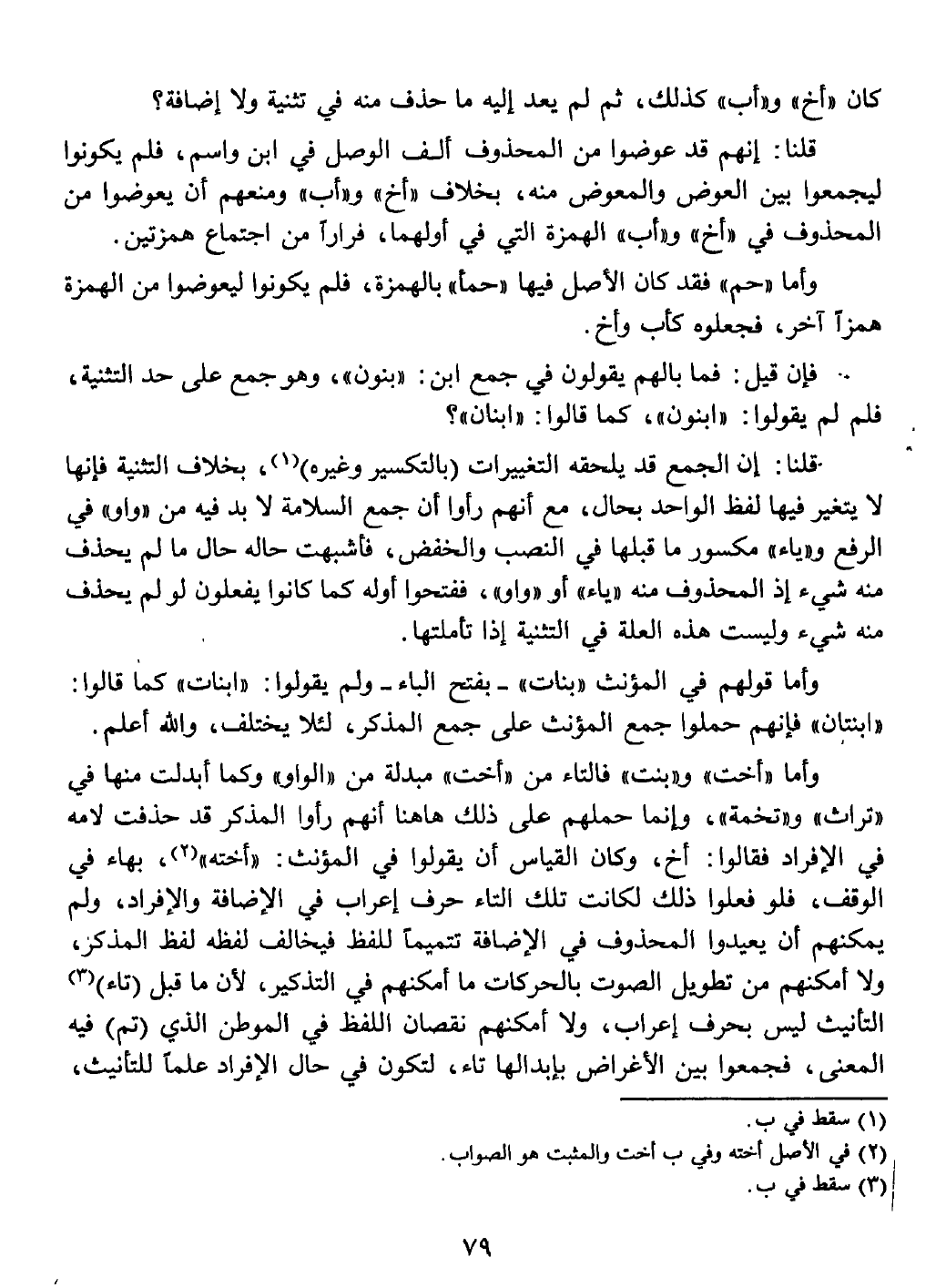 لا يتغير فيها لفظ الواحد بحال، مع أنهم رأوا أن جمع السلامة لا بد فيه من " واو " في الرفع و " ياء " مكسور ما قبلها في النصب والخفض، فأشبهت حاله حال ما لم يحذف منه شيء إذ المحذوف منه " ياء " أو " واو "، ففتحوا أوله كما كانوا يفعلون لو لم يحذف منه شيء وليست هذه العلة في التثنية إذا تأملتها.