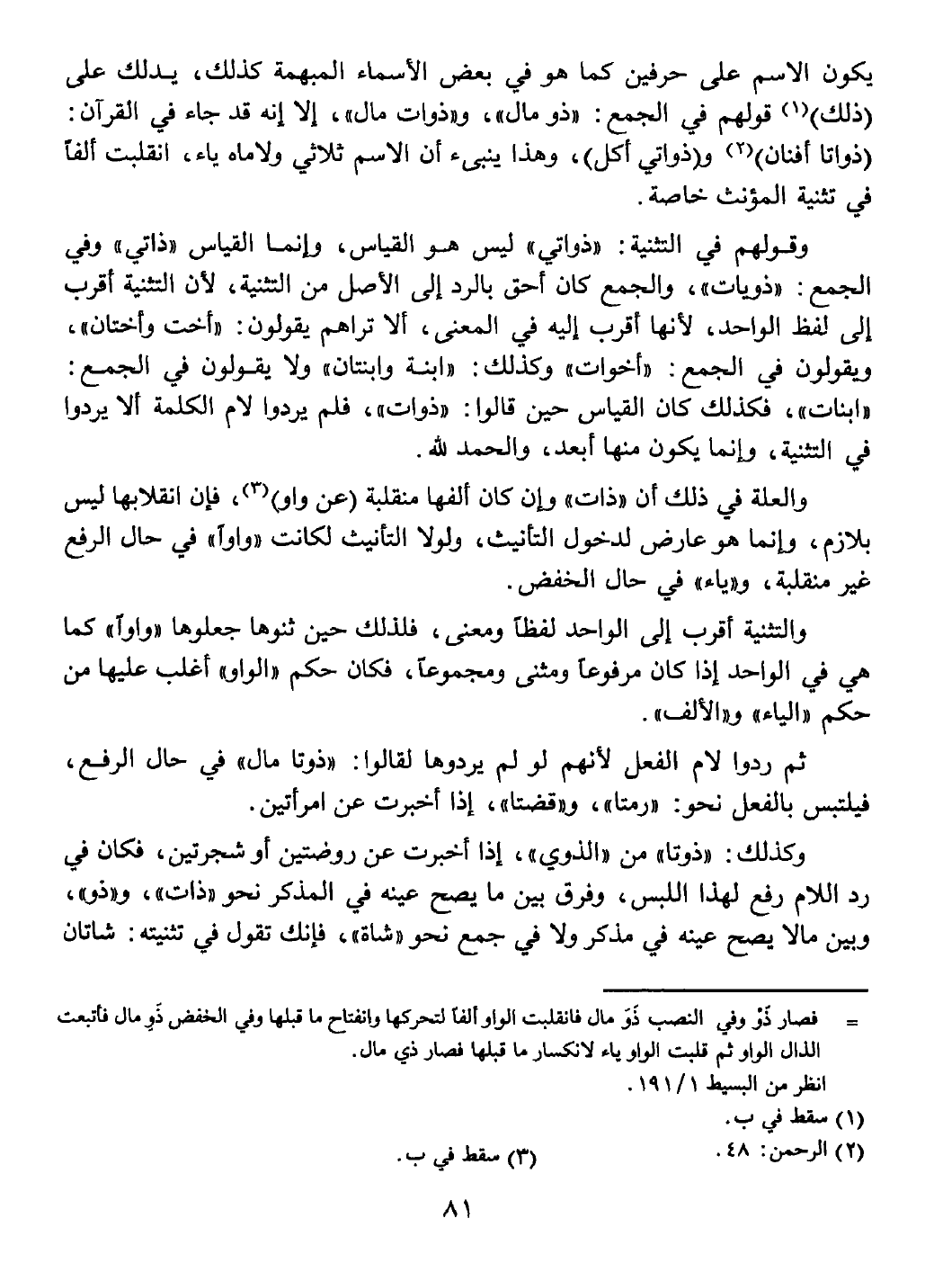 (ذلك) قولهم في الجمع: " ذو مال "، و " ذوات مال "، إلا إنه قد جاء في القرآن: (ذَوَاتَا أَفْنَانٍ) و (ذَوَاتَيْ أُكُلٍ) ، وهذا ينبئ أن الاسم ثلاثي ولاماه ياء، انقلبت ألفاً في تثنية المؤنث خاصة.
