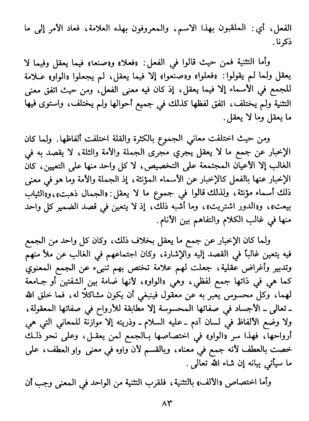 فيه يتعين غالباً في القصد إليه والإشارة، وكان اجتماعهم في الغالب عن ملأ منهم وتدبير وأغراض عقلية، جعلت لهم علامة تختص بهم تنبئ عن الجمع المعنوي كما هي في ذاتها جمع لفظي، وهي " الواو "، لأنها ضامة بين الشفتين أو جامعة لهما، وكل محسوس يعبر به عن معقول فينبغي أن يكون مشاكلاً له، فما خلق الله - تعالى - الأجساد في صفاتها المحسوسة إلا مطابقة للأرواح في صفاتها المعقولة.