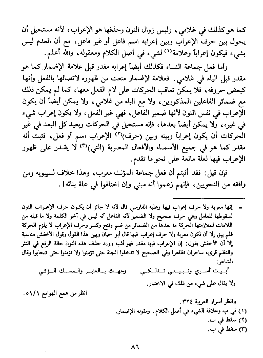 كبعض حروفه، فلا يمكن تعاقب الحركات على لام الفعل معها، كما لم يمكن ذلك مع ضمائر الفاعلين المذكورين، ولا مع الياء من غلامي، ولا يمكن أيضاً أن يكون الإعراب في نفس النون لأنها ضمير الفاعل، فهي غير الفعل، ولا يكون إعراب شيء في غيره، ولا يمكن أيضاً بعدها، فإنه مستحيل في الحركات وبعيد كل البعد في غير الحركات أن بكون إعراباً وبينه وبين (حرف) الإعراب اسم أو فعل، فثبت أنه مقدر كما هو في جميع الأسماء والأفعال المعربة (التي) لا يقدر على ظهور الإعراب فيها لعلة مانعة على نحوما تقدم.
