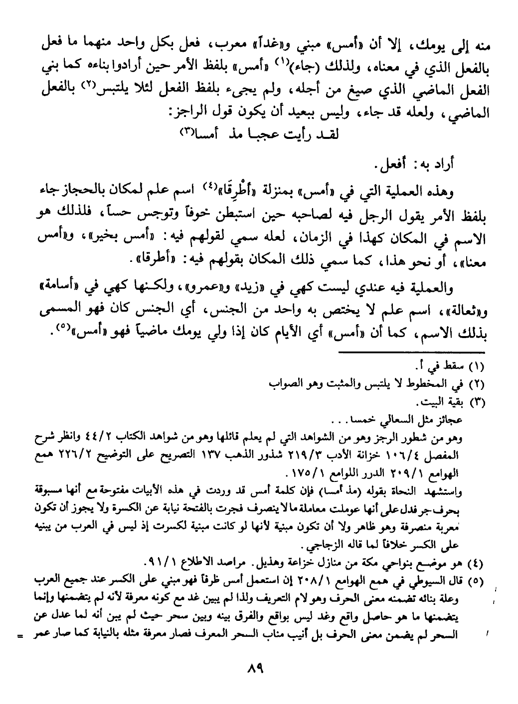 منه إلى يومك، إلا أن " أمس " مبني و " غد " معرب، فعل بكل واحد منهما ما فعل بالفعل الذي في معناه، ولذلك (جاء) " أمس " بلفظ الأمر حين أرادوا بناءه كما بني الفعل الماضي الذي صيغ من أجله، ولم يجئ بلفظ الفعل لئلا يلتبس بالفعل